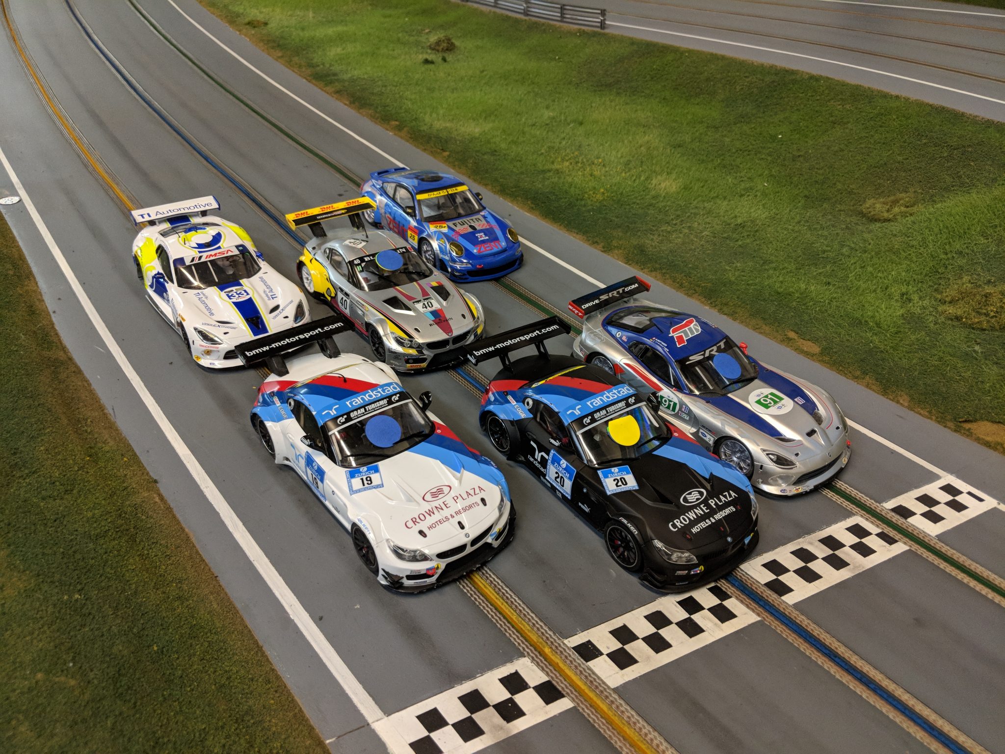 Well it’s been a while since we ran 1/24 scale cars on the ASCC track. It was a day full of challenges in tech as the start of a brand new series begins. Nothing ever goes as planned and this was no exception. The rules were taking from the European series and then adjusted for our MJK spec tire. The issue began with Steve’s Viper as we’re allowing the older metal chassis as well as the new carbon fiber chassis. The Viper body is heavier than the BMW or Porsche body combined with the heavier metal chassis caused Steve to go over the maximum body and combined weight. We will adjust the maximum weights for the older chassis. The other struggle was the rear track. Some racers didn’t check their cars prior to tech and we kicked back due to the rear track being wider than 80mm. Fortunately for those racers, Marty brought his box of Scaleauto spacers with him, so they could get their cars legal. The one issue that had us all shaking out heads was with Marty’s 2 carbon fiber chassis cars not passing the chassis height limit. After he tried several different front tires, we measured his front axle to the chassis plate to find that it’s 1mm taller than the other carbon fiber chassis cars. He spent so much time getting that discovered and fortunately had an older chassis car that he could use.