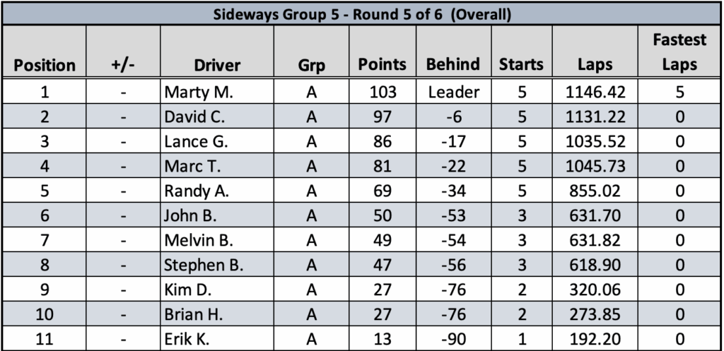 The leaders of the series have all recorded 5 starts, and and the points spread is just wide enough to keep a typical finish from changing the current order. However, a DNS or DNF by the top two drivers may be just enough room for the 3rd and 4th position to flip. Maybe.