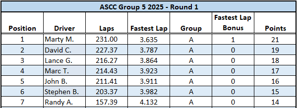 ASCC Group 5 2025, Race 1- July 26th, 2025 – Results