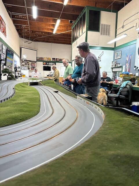The racing was close with the only real issues being related to the tire pick up on the track. You could see in just about every corner little clumps of sticky rubber – just like real race tracks. These little clumps of rubber wreak havoc with a cars handling. If you run over one and pick it up on your rear tires your car becomes unstable and difficult to drive. The best plan is to stay in the slot and not drift wide or de-slot when you are almost assuredly pick up at least one of these little clumps. David had issues with tire pickup on his car and John’s final heat was one to watch as John fought his car as it was bucking like a bronco everywhere on the track. He did an amazing job to keep his car on the track.