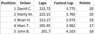 When it was all over, David had won the race but only by a half a lap over Marty but Marty did take fast lap to stay equal with David on points. Brian completed the podium in third place. Fourth was Marc and Fifth was John.