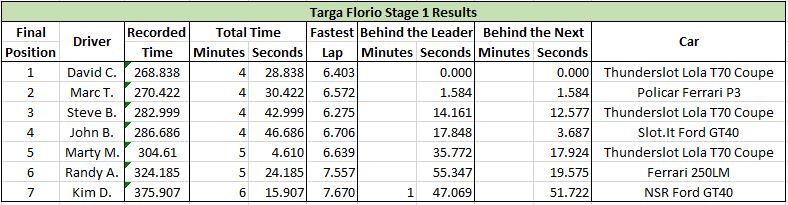 Third heat, David: Also running the Thunderslot Lola, David turned in a fast and consistent Fast Lap: 6.403, Average Lap: 6.72 40 laps total time: 268.8 seconds