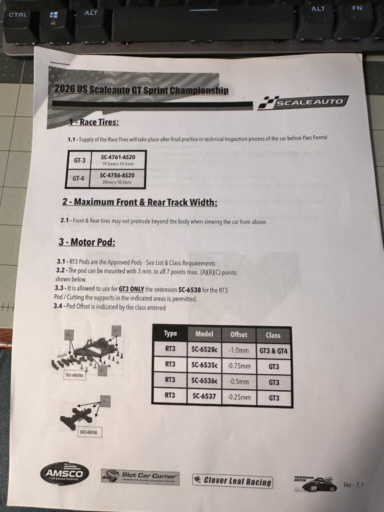 The Rules – Rules are always important and getting a deep understanding of them is key to setting up a competitive car. The rules for this event mandate the cars be run with the stock anglewinder configuration, Scaleauto shore 20 rear tires that cannot be glued or trued, and coated front tires. Just the simple question of what size wheels, of the three allowed, to use with the handout tires to achieve the rules minimum 1.0mm clearance under the motor is a big one. This is just one decision out of many that need to be made to get the car as competitive as possible.