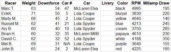Before the races began there was a small issue of downforce. No car is allowed to use magnets of any kind but you will still can get some magnetic downforce from the magnets inside the motor. To address this, the club has a standing rule that no car is allowed to have more than 30 grams of magnetic downforce from the motor. This has rarely been an issue but it became a big one in this series.
