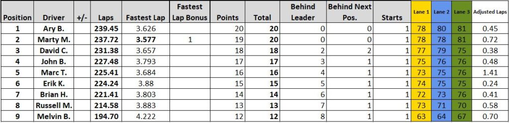 The racing started off quick and stayed that way to the end. These cars are such fun to drive and can allow even the newest racer to set some quick times.