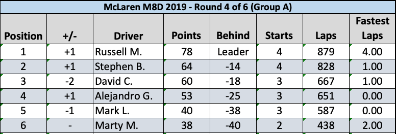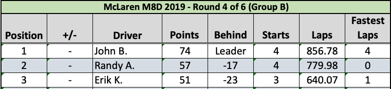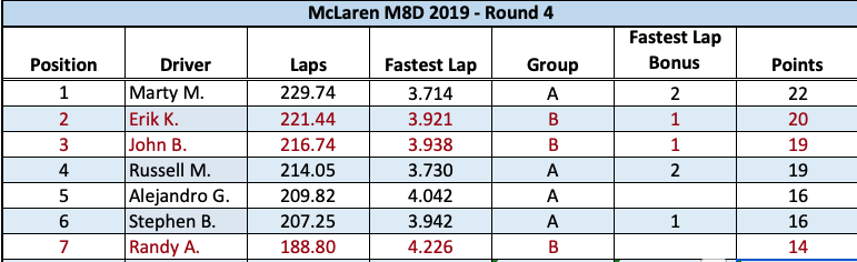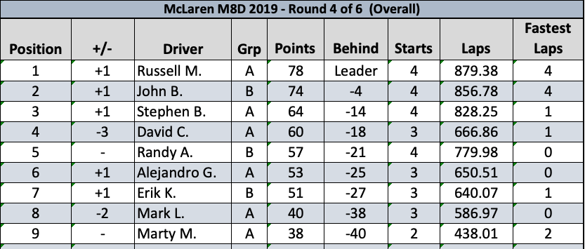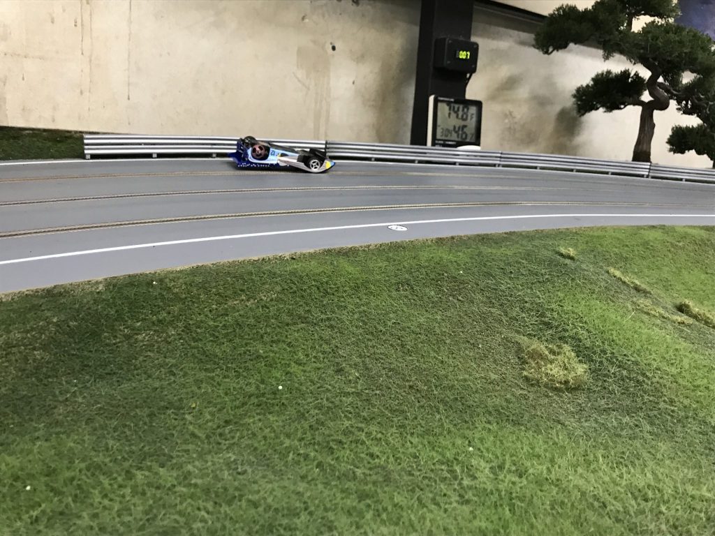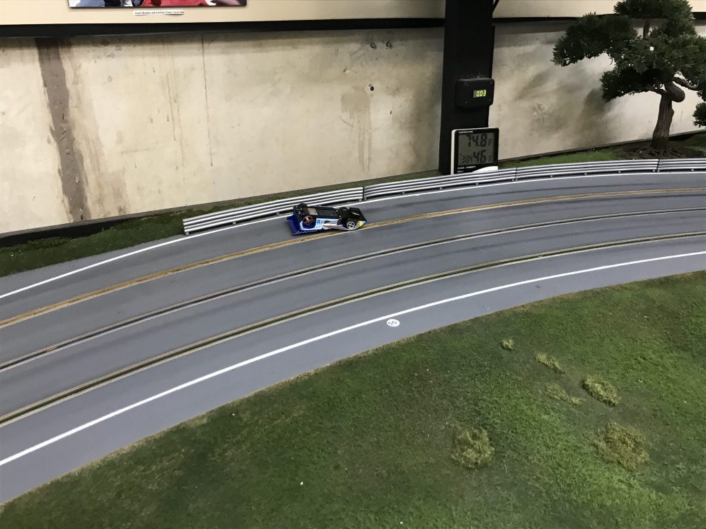 Slot.It McLaren Pre-Easter Meet, Round Four by Lotus Jr. While our entrants were down to seven, the racing was strong as ever. Marty blistered the track with 229.74 laps and a best lap of 3.714 finishing 1st overall. Erik put in a stellar performance with 221.44 laps, coming in 2nd overall, 1st B and fastest B lap of 3.921. John took 3rd overall and 2nd B with 216.74 laps. Russell’s speed appeared to made him destined for 2nd, but the Led Zepp McLaren lost a wheel past the bridge and several laps, finishing 4th overall and 2nd A with 214.05 laps. Alejandro struggled a bit finishing 3rd A with 209.82 laps. Steve ran 4th A with 207.25 laps followed by Randy in 3rd B with 188.8 laps. The 12 volt setting for Slot.It McLaren has an effect on tire wear as fairly large marbles are appearing on the track. Keeping these cars “on the button” is trickier than Thunderslot or Group C. Too much throttle and either the car slides or jumps out of the guide. But proper throttle application will reward a driver with good lap times. It has proved to be an interesting balancing act.