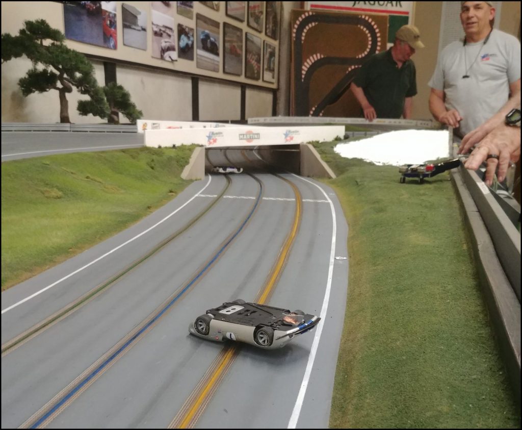 Round 3 of the 2019 Thunderslot series was one of the fastest races that the club has run. Marty threw down the gauntlet in the first heat, running 78 laps in Blue. The fourth heat was a great battle with David, Alejandro and Russell all turning 78 laps and David setting his second-best race lap at 3.654 seconds. Heat #7 had a spectacular crash between Mark and Marc on the last turn of the last lap, with both cars ending upside down, Marc in front of the driver’s station and Mark under the bridge. Randy had his fastest ever race lap (3.755) in the final heat.