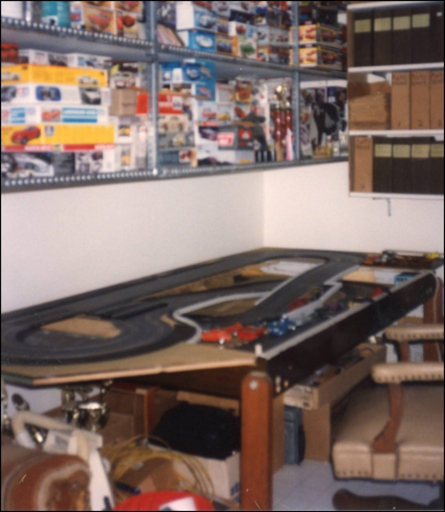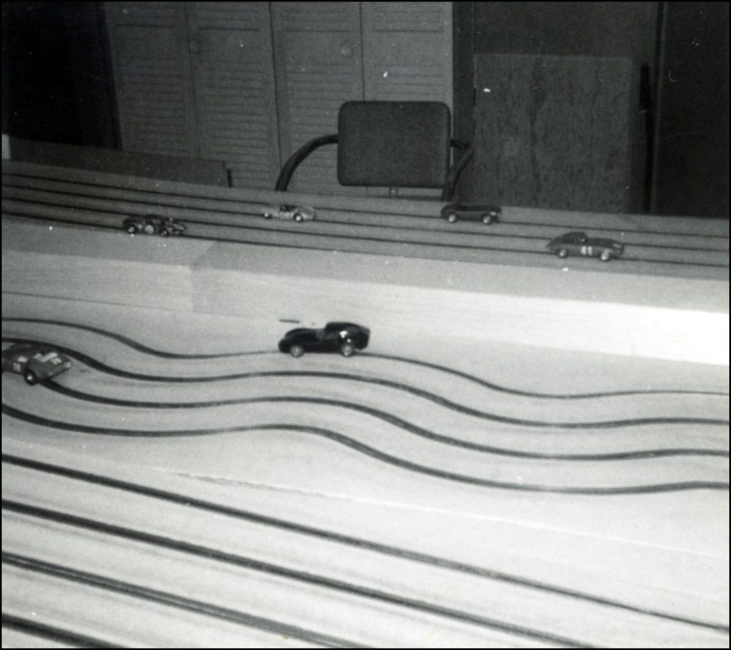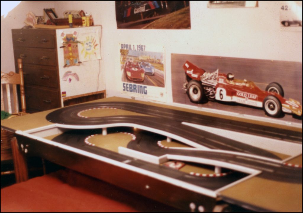 In 1964 my family was remodeling our house, adding a den/family room adjacent to my parent’s bedroom and the bedroom that my younger brother and I shared. I asked if a 10’ by 10’ addition to our bedroom, where I could build a slot track, could be incorporated into the plans, and my parents approved! I started designing a wooden track:
