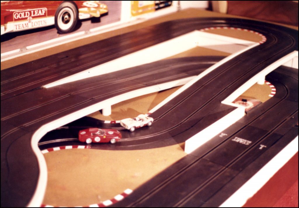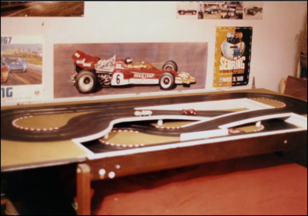 Sometime during pre-production, I decided that my 10’ by 7’ track would be too big for the new room, so we moved our twin beds into the new room, leaving our 12’ by 14’ bedroom for the track. Needless to say, the track dominated the previous bedroom. My father had a carpenter build the base, with two by four legs and a 1” by 6” skirt and cross braces. I did everything else by myself. I bought two sheets of ¾” plywood ten feet long, cut the raised overpass with a jig saw and borrowed a router for the slots. This was the first time I had used power tools and the first time I worked with wood. I painted the track and wired it, using aluminum tape because it was cheaper. I had power connections at two places on the track so power flow would be equalized. I built open-front garages, Sebring style, along the front straight, although these pits were never finished. I mostly had hard plastic slot kits or ready-to-runs in 1/32 scale. This was before the “Thingies” and even before vacuum bodies became popular. I had Revell, Monogram, and Strombecker cars, and built all three Cox Chaparrals. The track had a 42 foot length in each of its 4 lanes. This is about the same length of routed slots as the King’s track. The two photographs below are the only photos of the track.