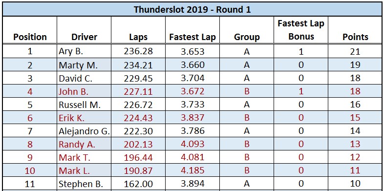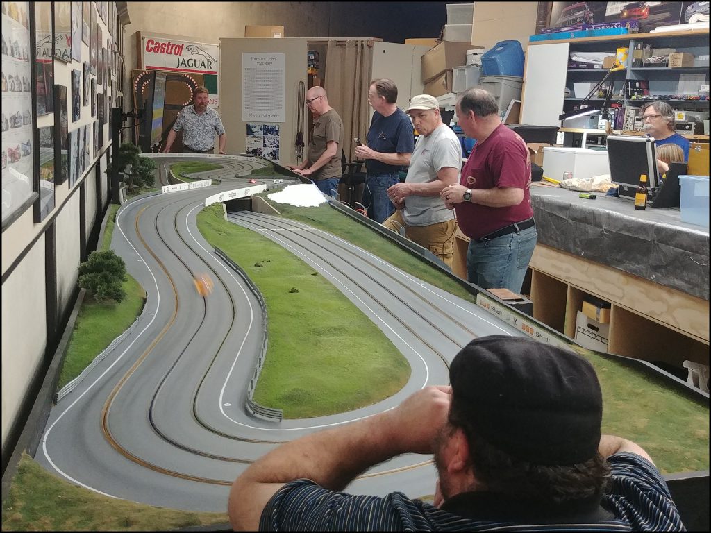 Whew! Well, the first race of the Thunderslot LolaT70 Series for 2019 was one for the books. The action was hot and heavy, with fierce competition throughout the field, as thunderstorms raged outside. With thirty seconds to go in the final heat, there was a clap of thunder and the lights went out. It was only momentary, but long enough to crash the computers. The track computer had an auto-save through the previous heat, but there was no saving of the race video. Ary was able to recover the first ten heats but there was no easy way to resume the race. The final heat had to be re-run as a separate race. Between Ary’s work and Steve compiling data, the race was saved.